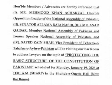 Read MoreNotification Mr. Mehmood Khan Achakzai Hon’ble Opposition Leader of the National Assembly, Senator Allama Raja Nasir Abbas Jafri, Mr. Asad Qaisar (MNA) and Sayed Zain Shah Vice President of Tehreek-e-Tahafuz-e-To Address on ‘Protecting’ the Basic Structure of the Consititution of Pakistan.