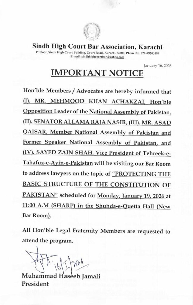 Notification Mr. Mehmood Khan Achakzai Hon’ble Opposition Leader of the National Assembly, Senator Allama Raja Nasir Abbas Jafri, Mr. Asad Qaisar (MNA) and Sayed Zain Shah Vice President of Tehreek-e-Tahafuz-e-To Address on ‘Protecting’ the Basic Structure of the Consititution of Pakistan.